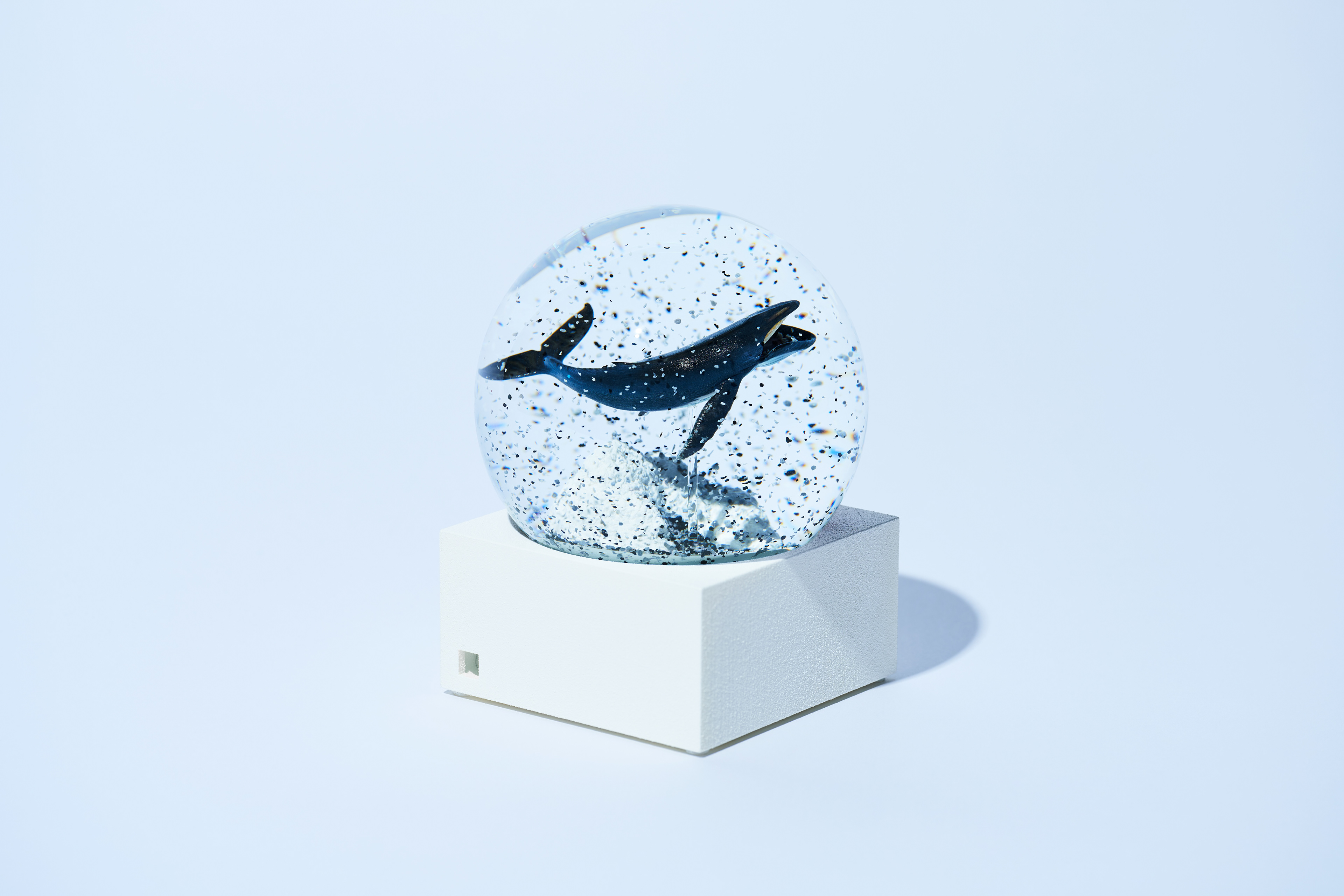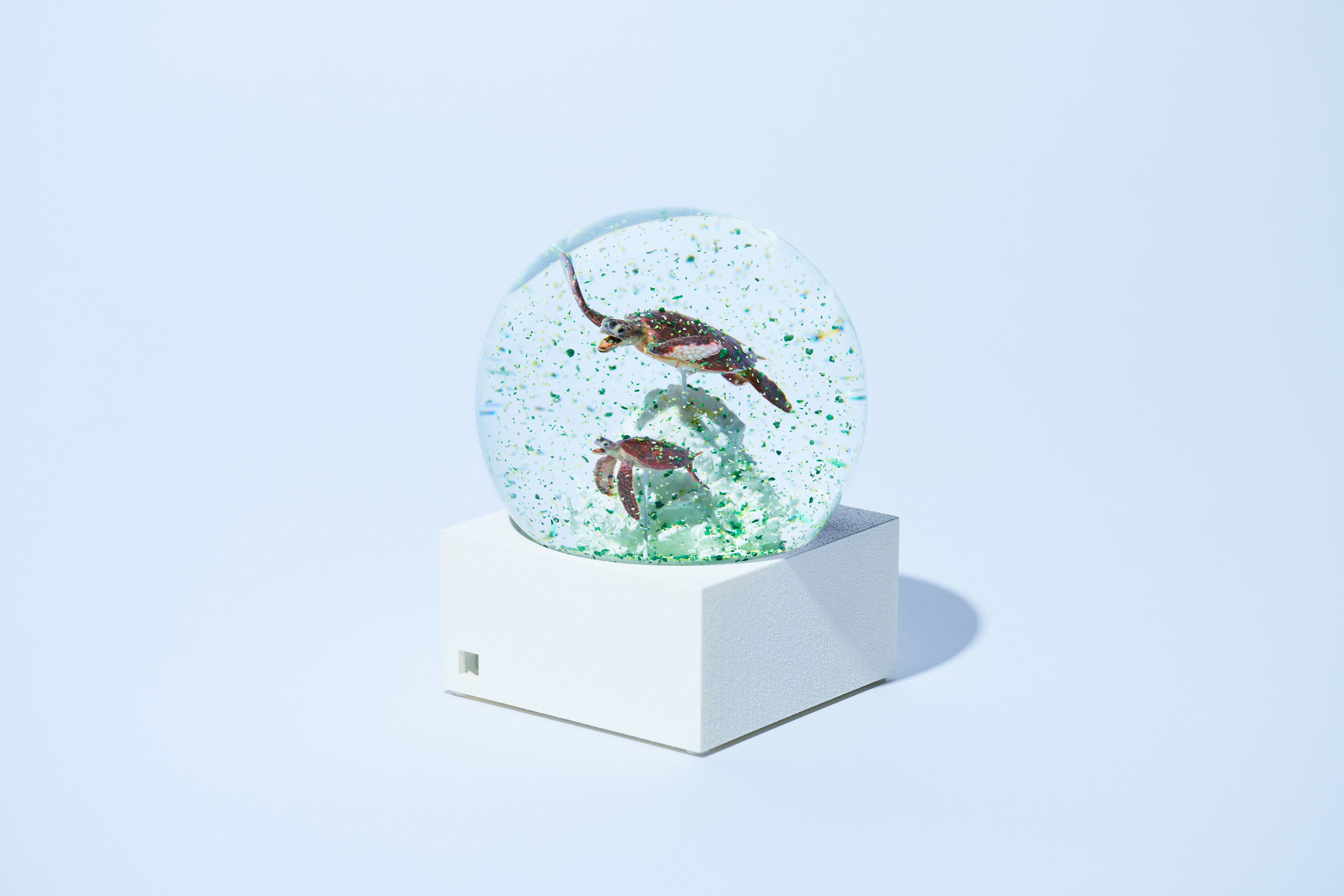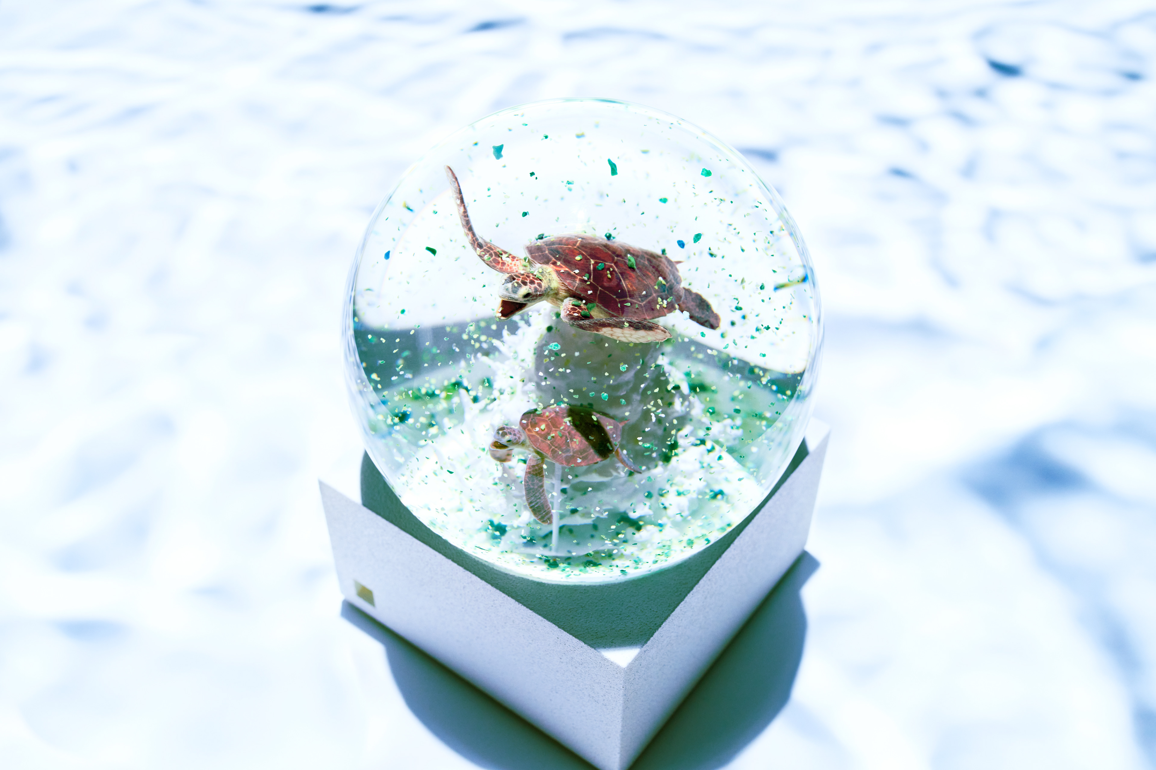 ドーム内をカラフルなフレークが舞うとその生き物がマイクロプラスチックを捕食しているように見えるスノードームのアート作品。ドーム内のフレークには、実際に伊勢近海の海から採集したプラスチックを使用。