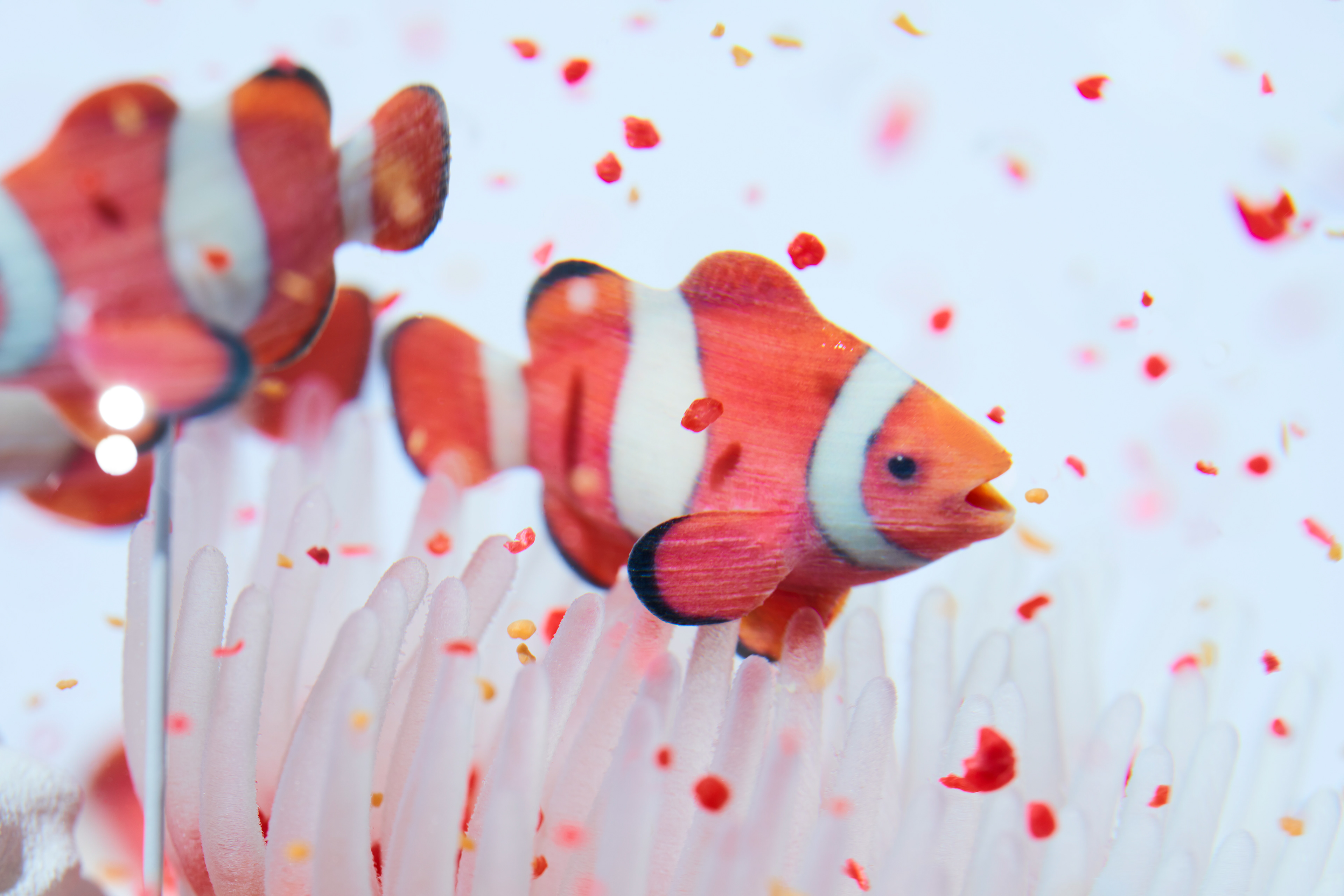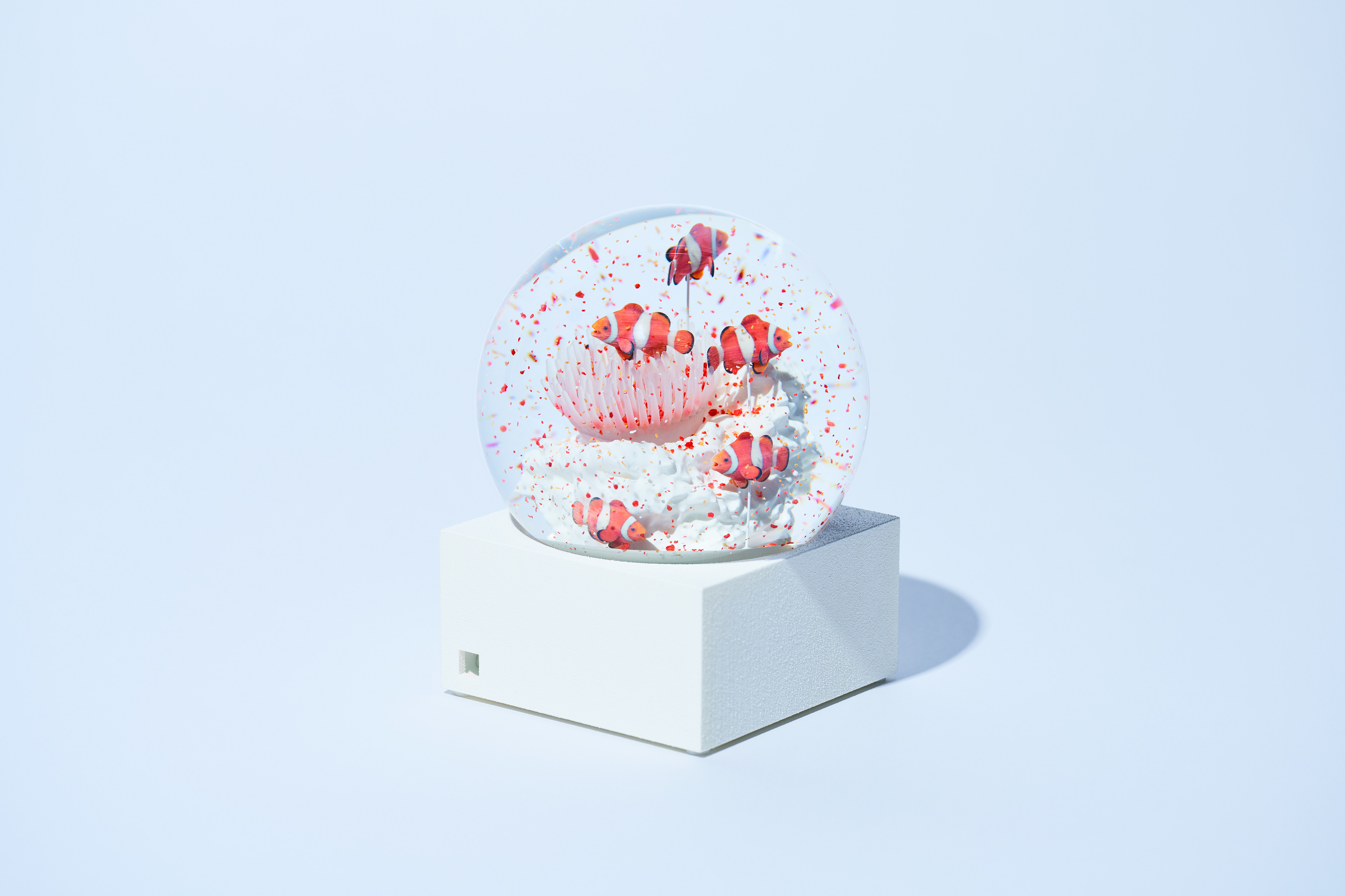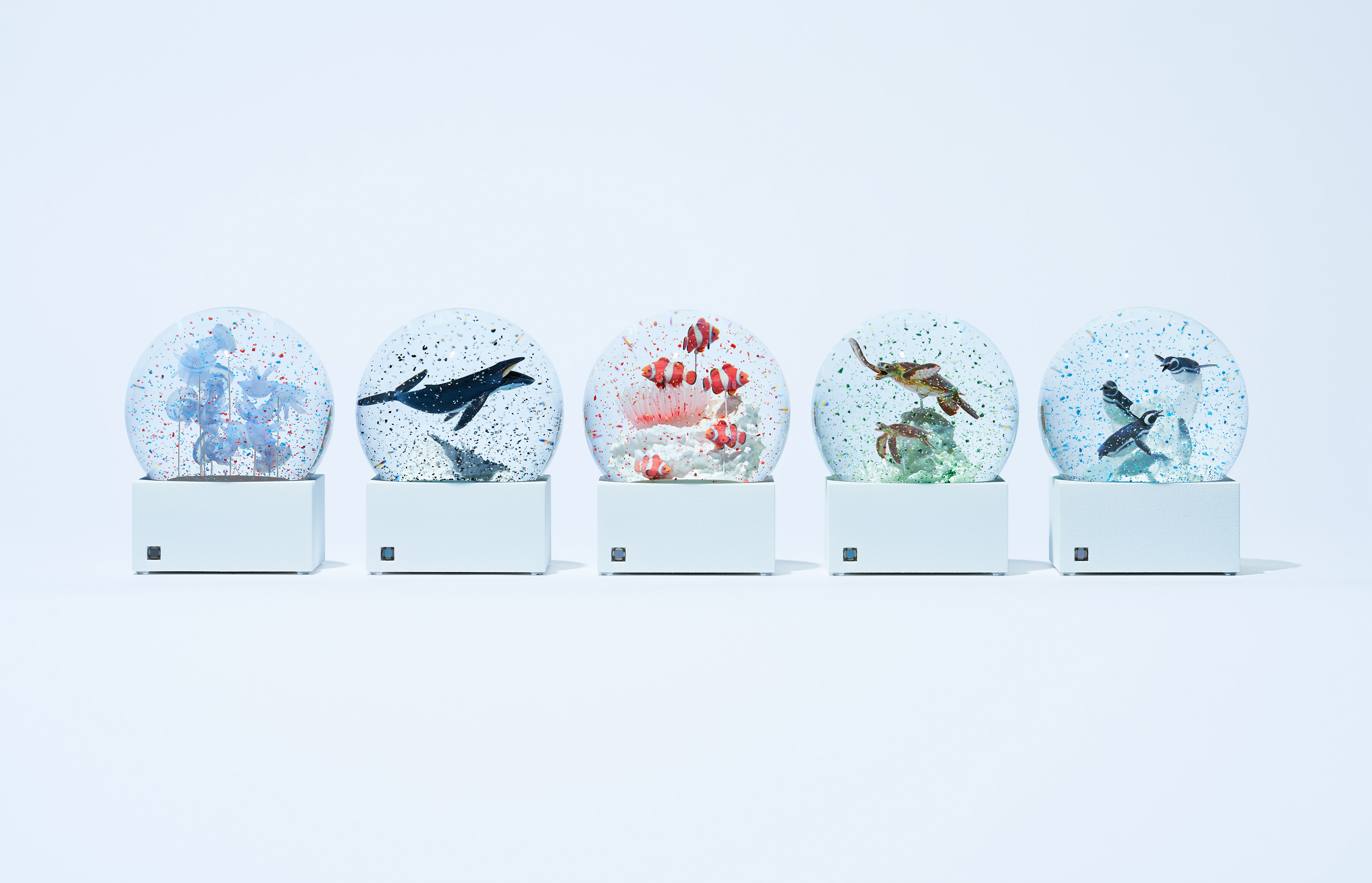 ドーム内をカラフルなフレークが舞うとその生き物がマイクロプラスチックを捕食しているように見えるスノードームのアート作品。ドーム内のフレークには、実際に伊勢近海の海から採集したプラスチックを使用。