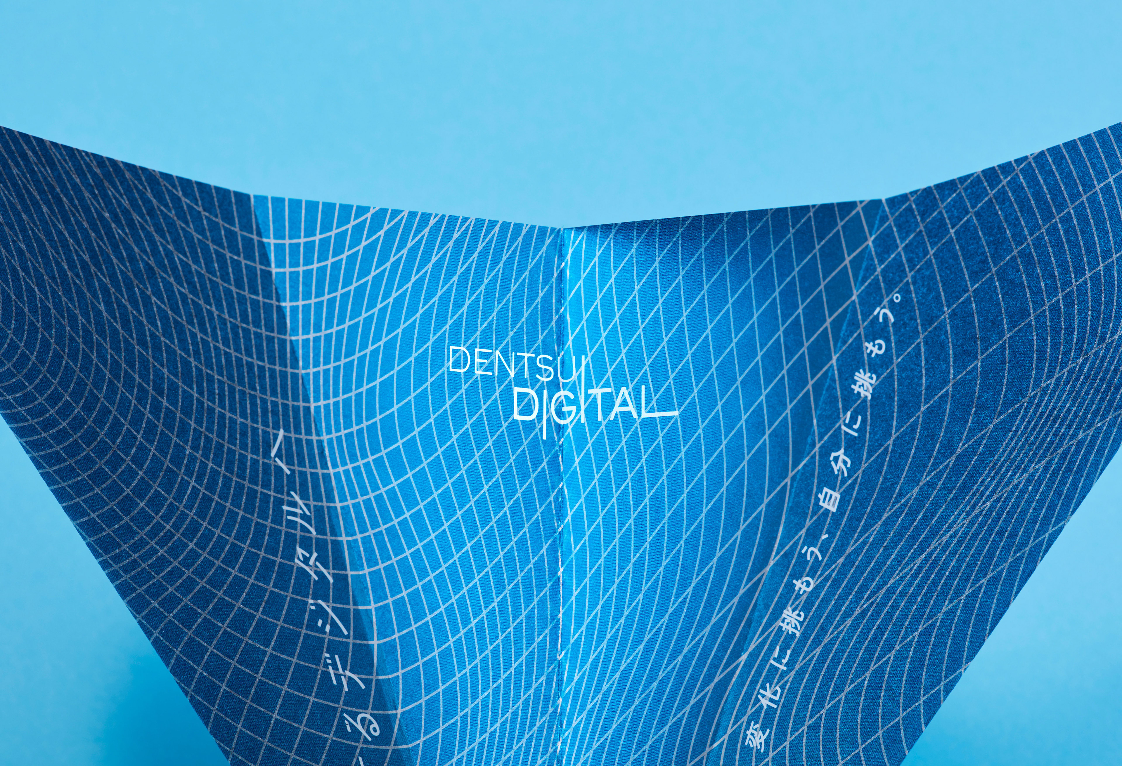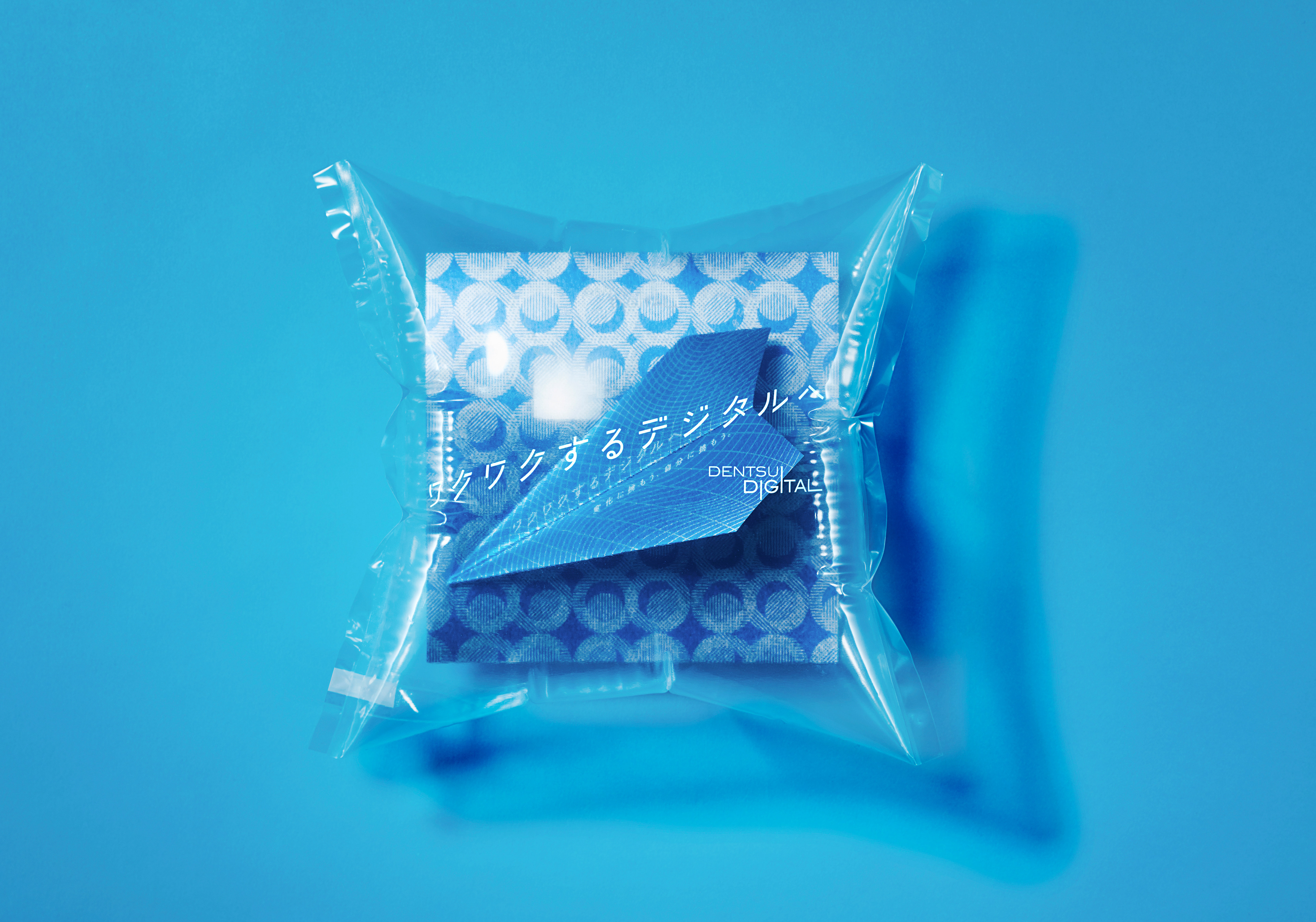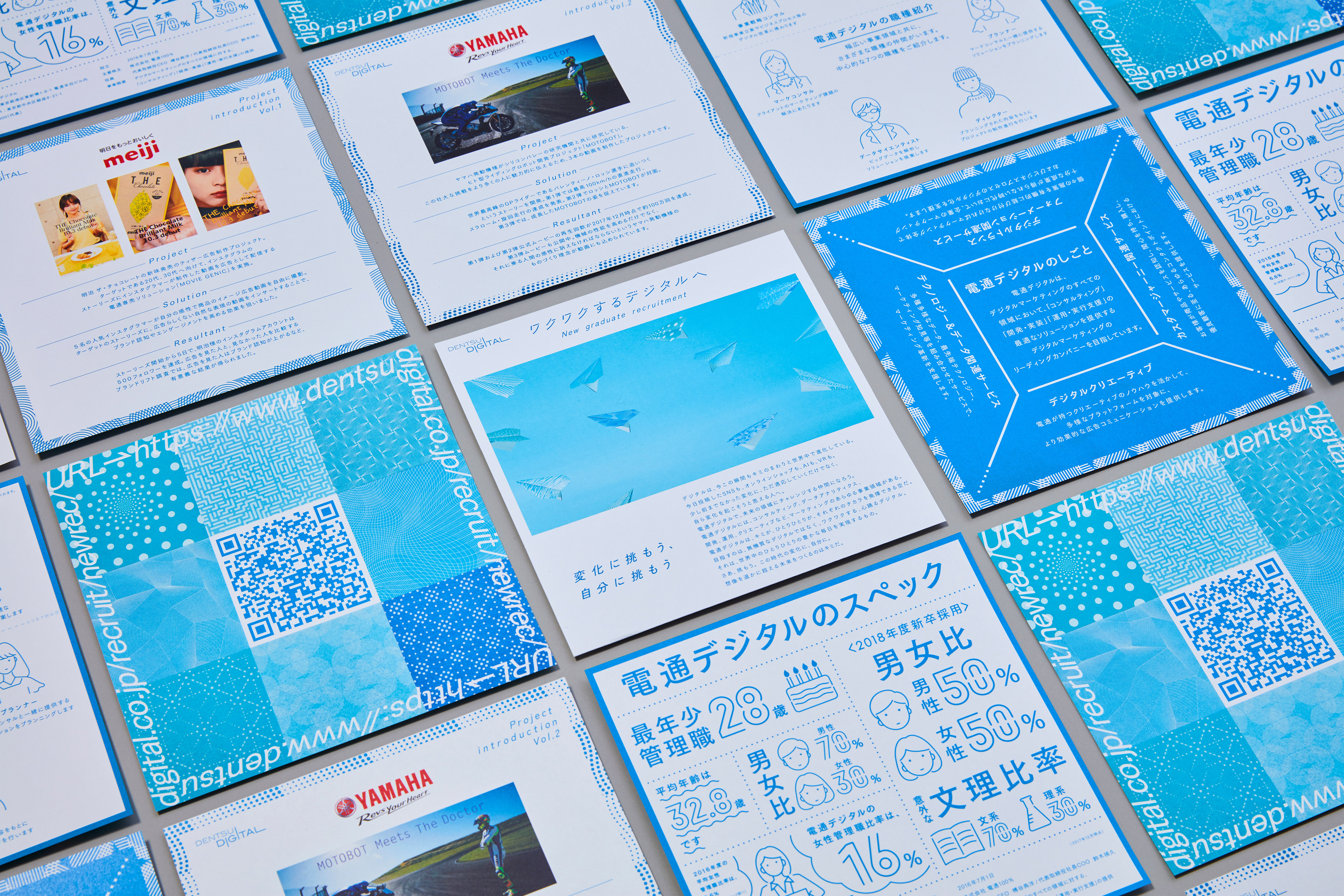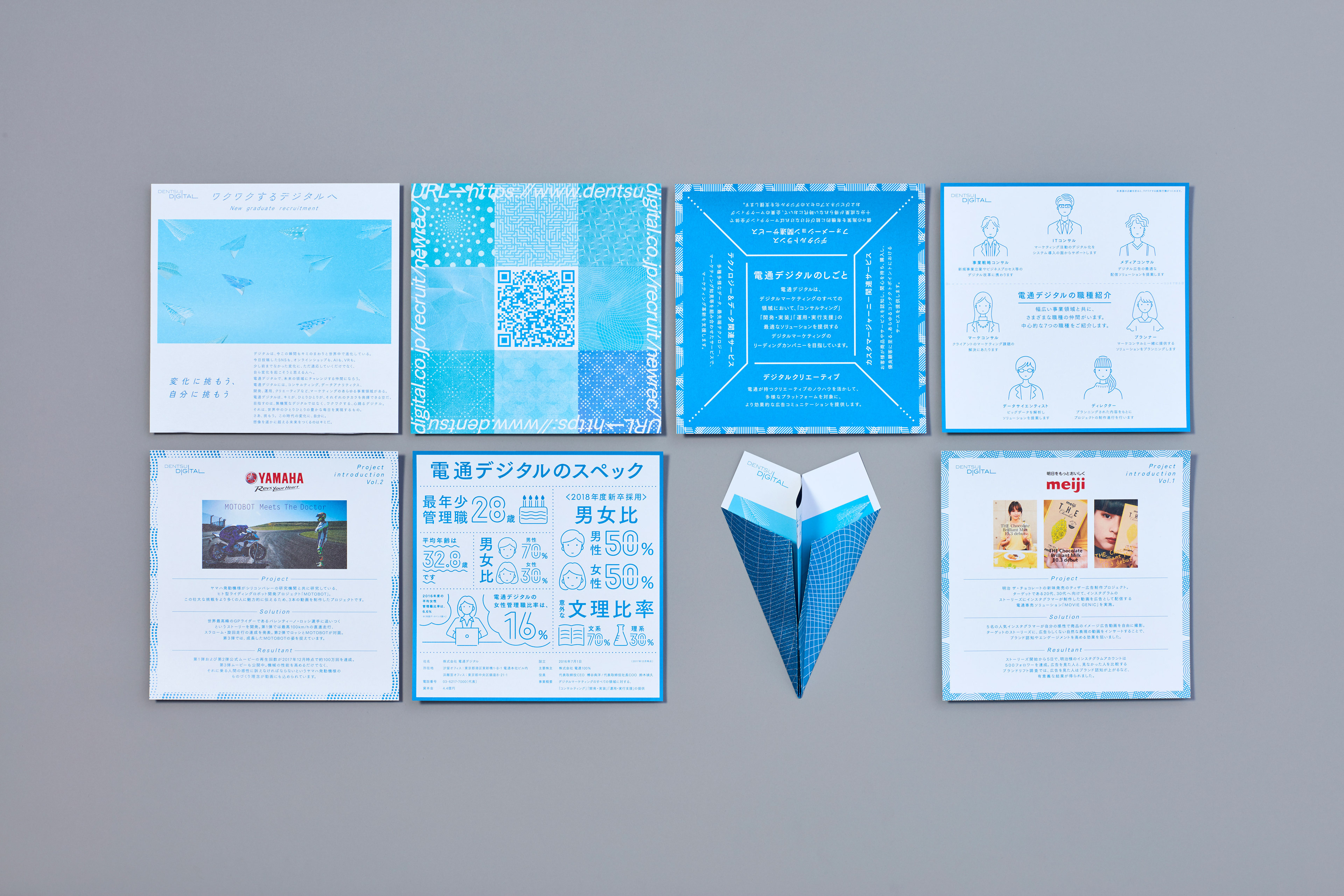 Dentsu Digital の2019年度の新卒採用の説明会用リーフレット。電通デジタルのブルートーンの紙飛行機に、デジタルの内包する様々な可能性を彷彿させるパターンをデザイン。 パンフレットキットに案内のダイジェストが紹介されており、詳細は裏面記載のQRコードからサイトに遷移可能。