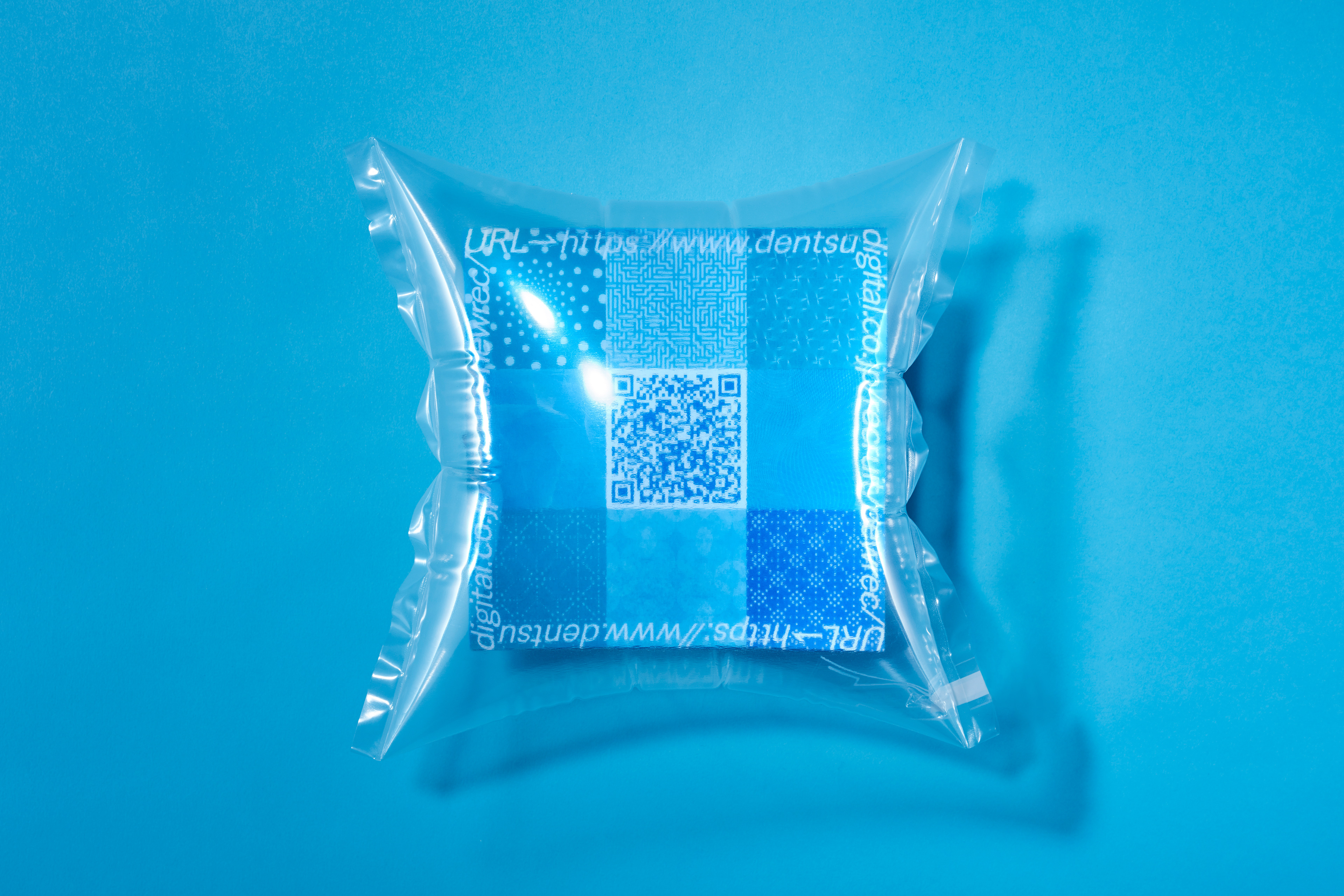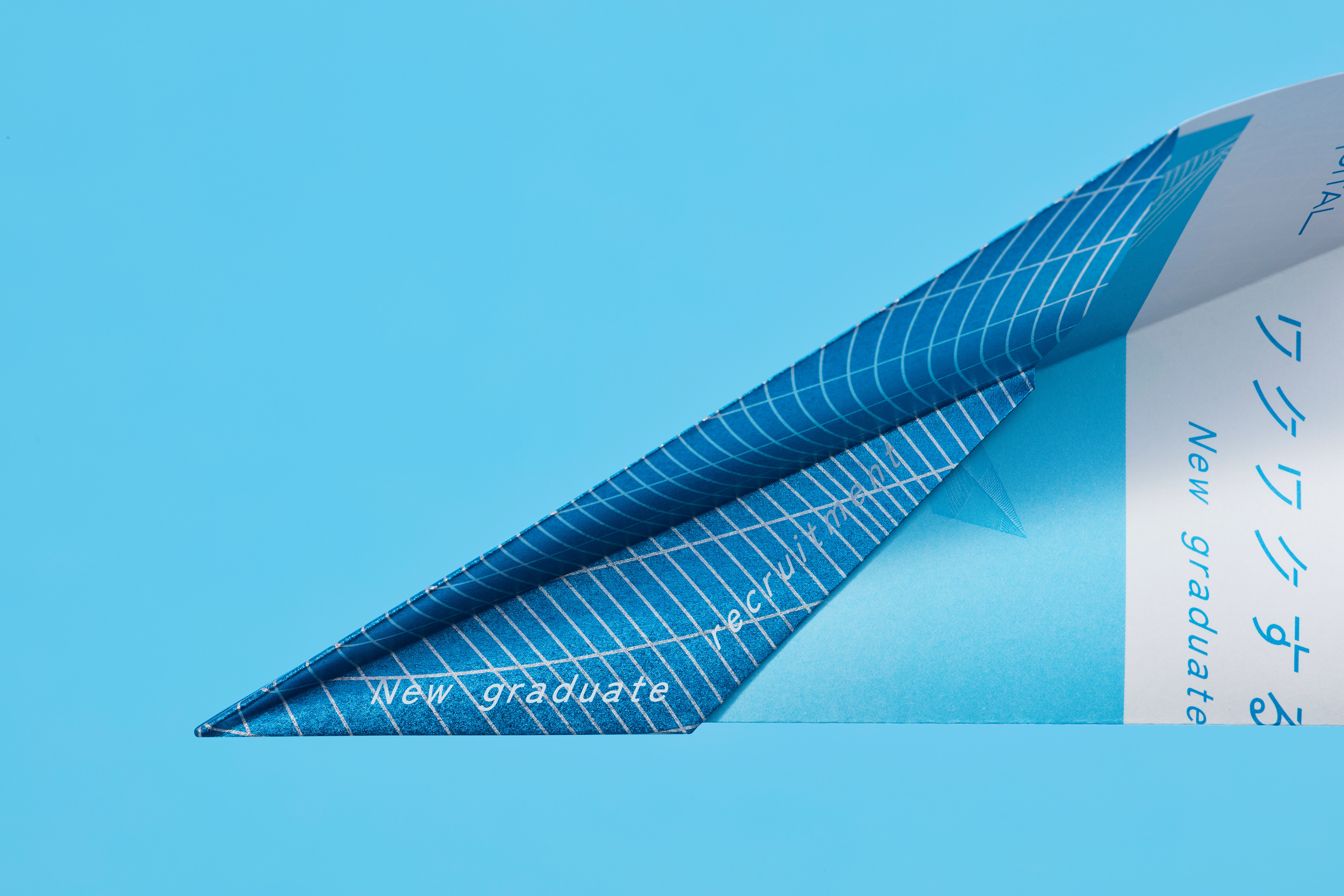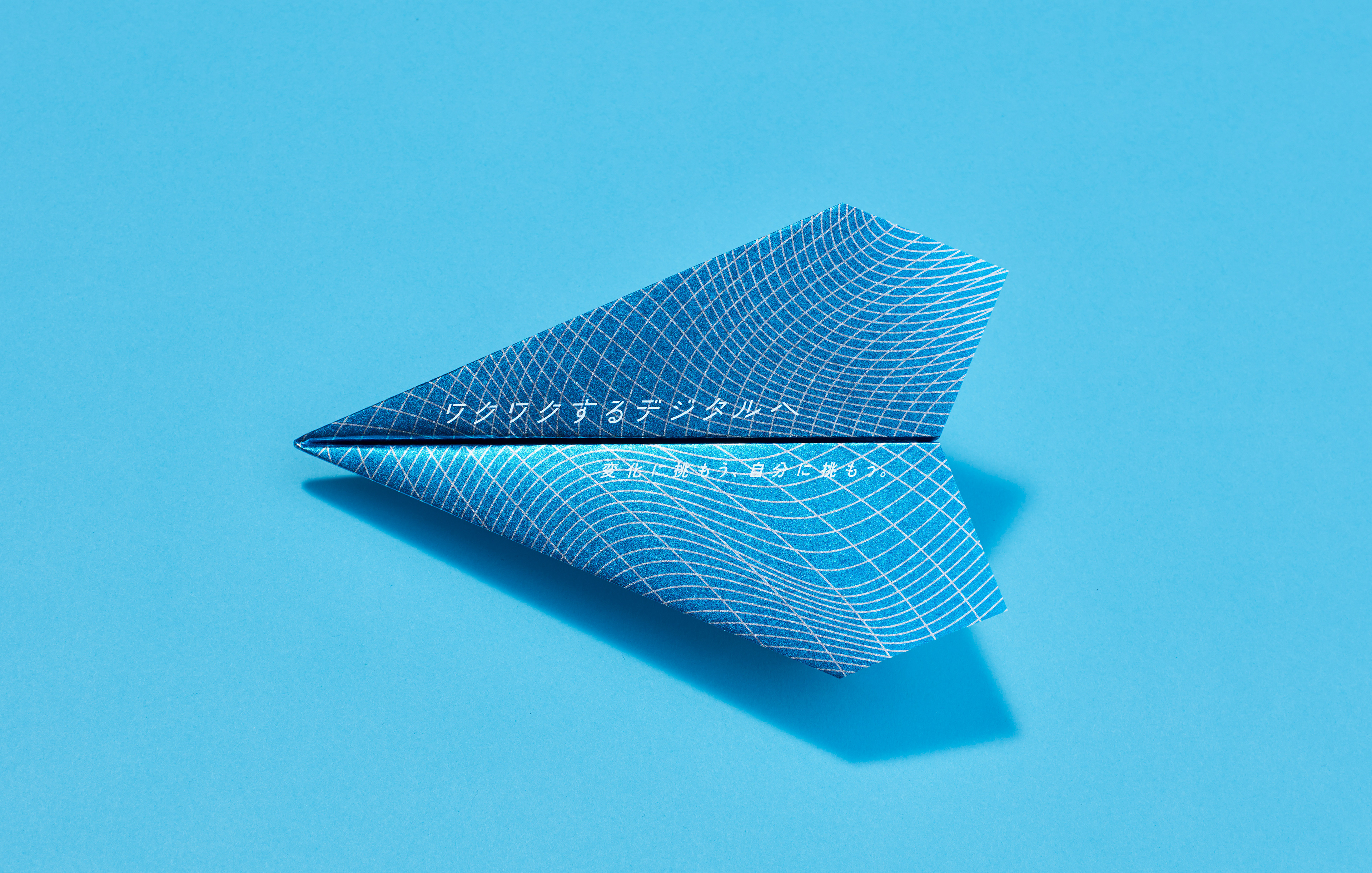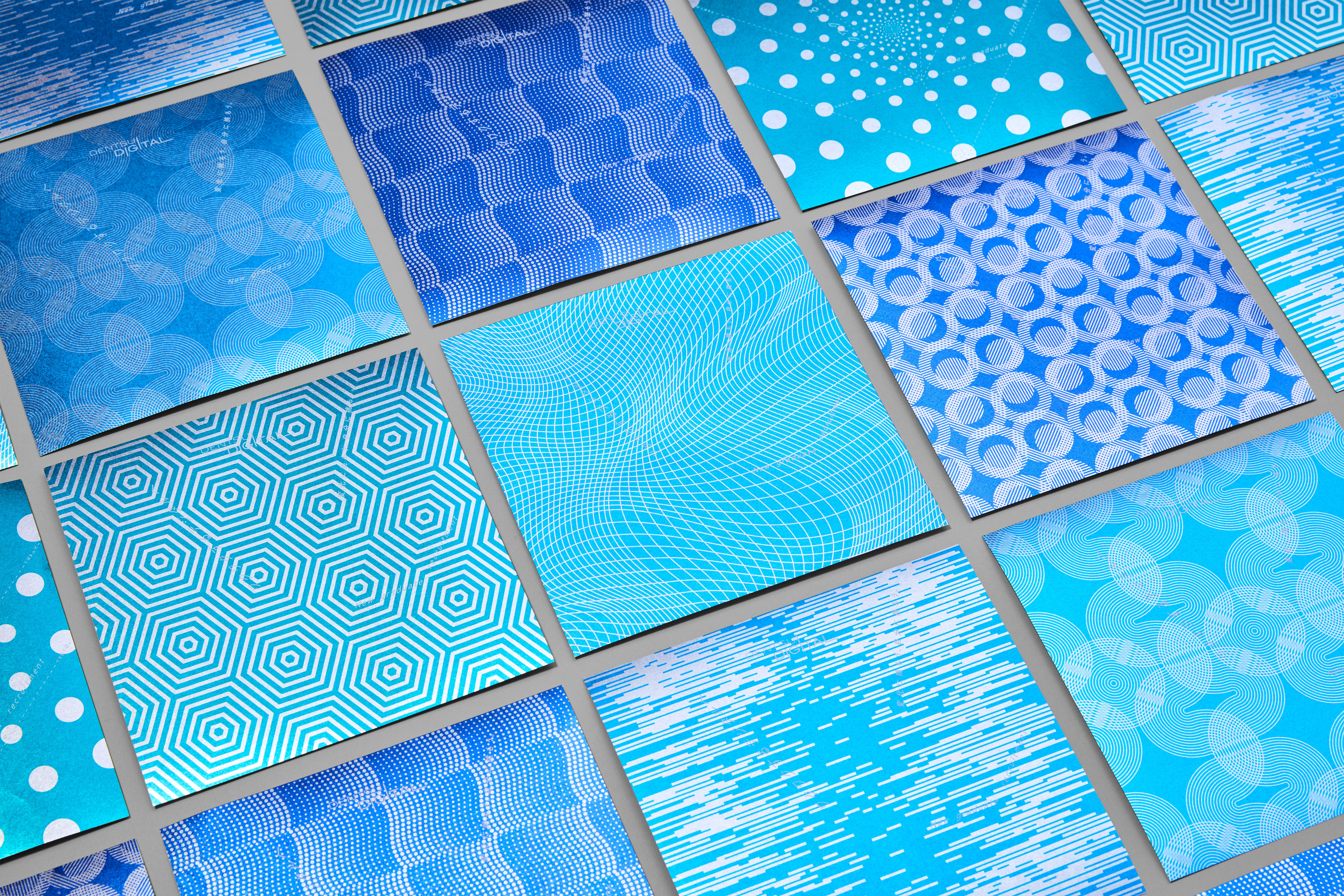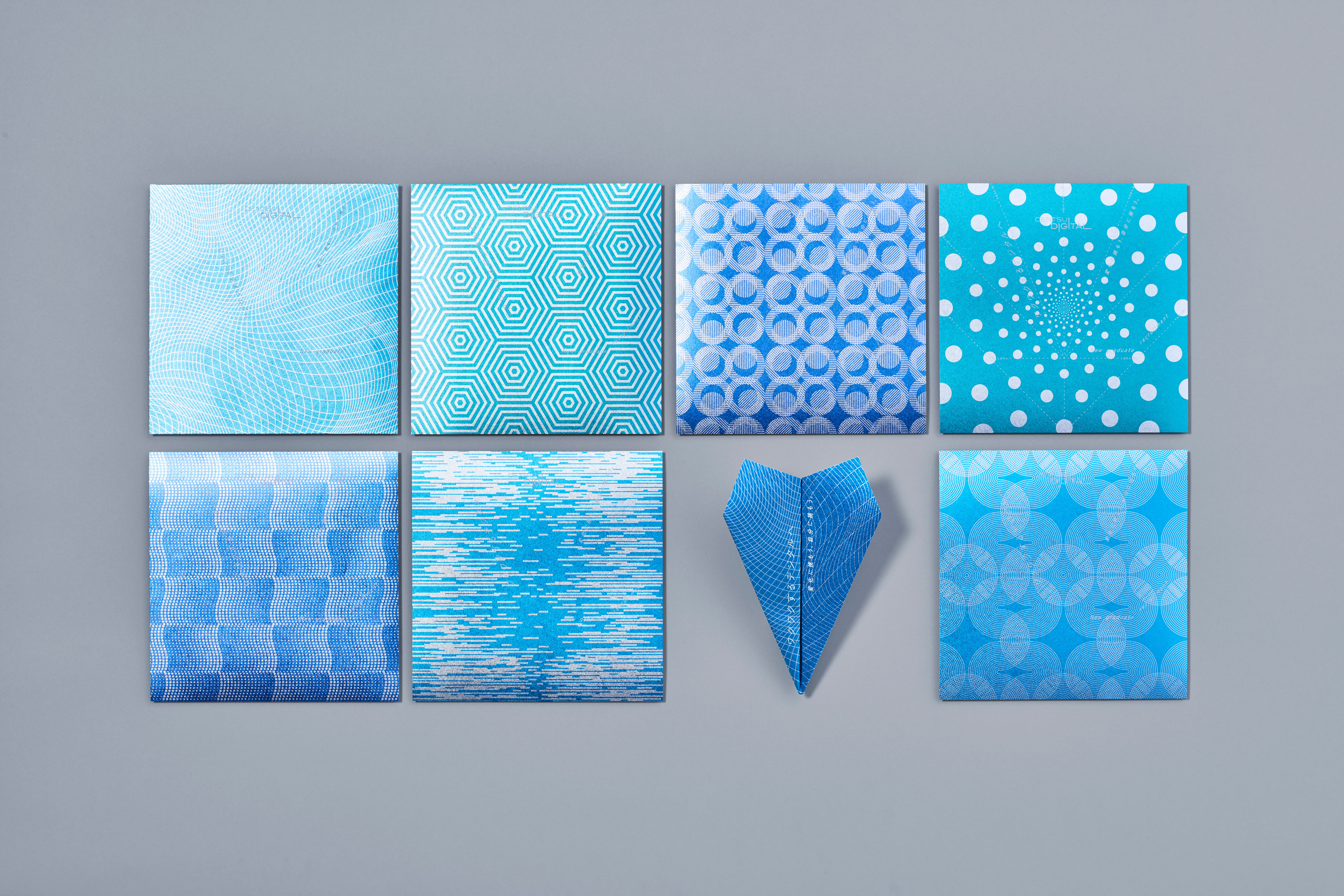 Dentsu Digital の2019年度の新卒採用の説明会用リーフレット。電通デジタルのブルートーンの紙飛行機に、デジタルの内包する様々な可能性を彷彿させるパターンをデザイン。 パンフレットキットに案内のダイジェストが紹介されており、詳細は裏面記載のQRコードからサイトに遷移可能。