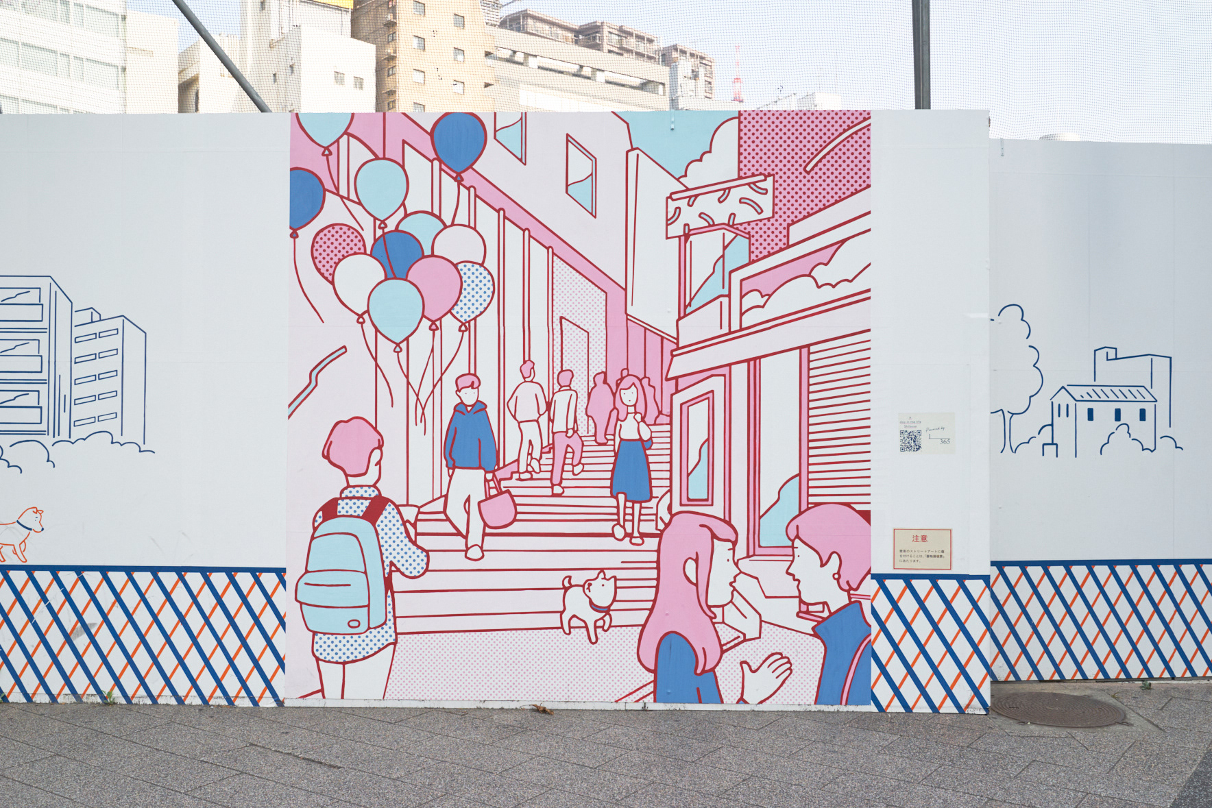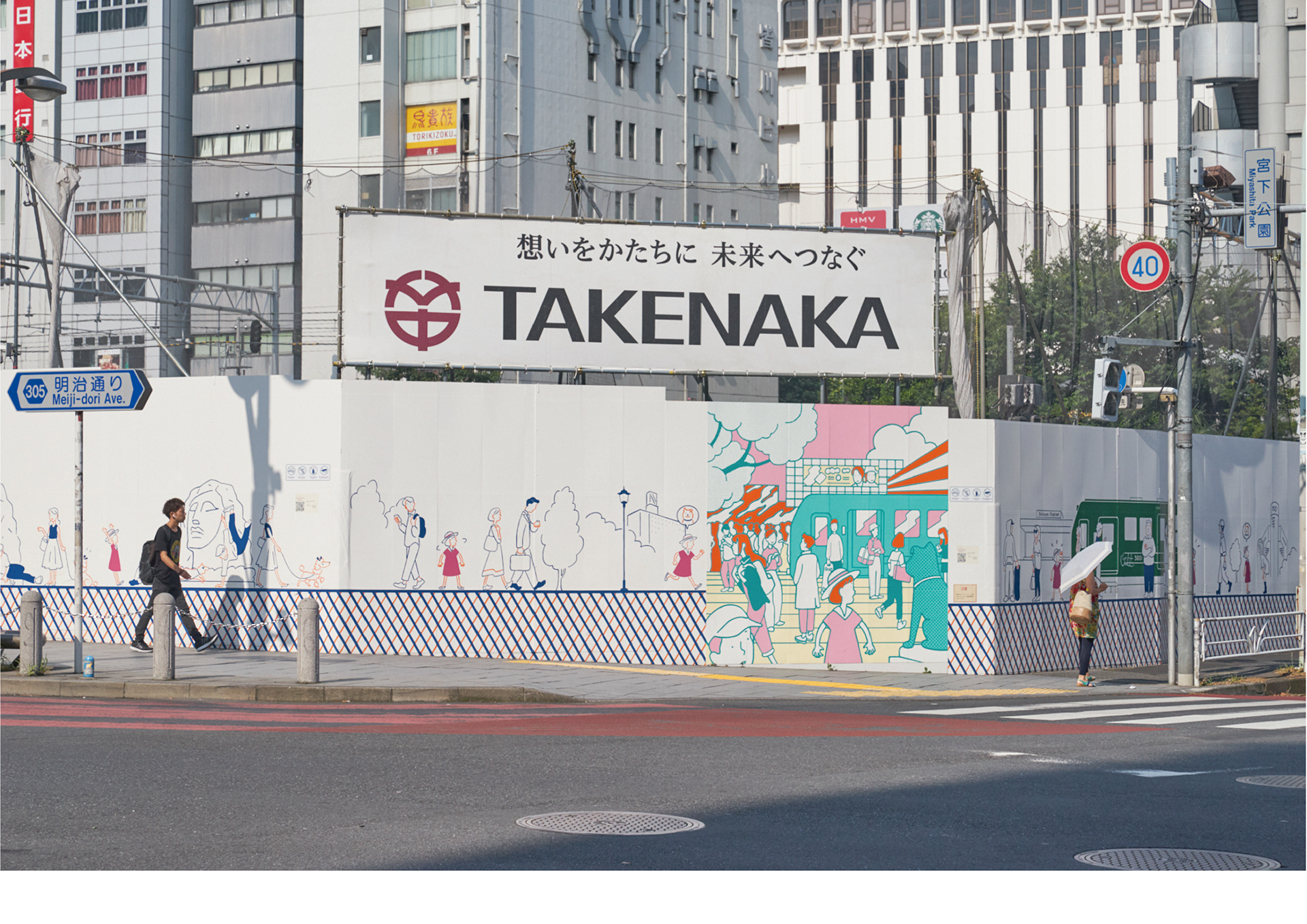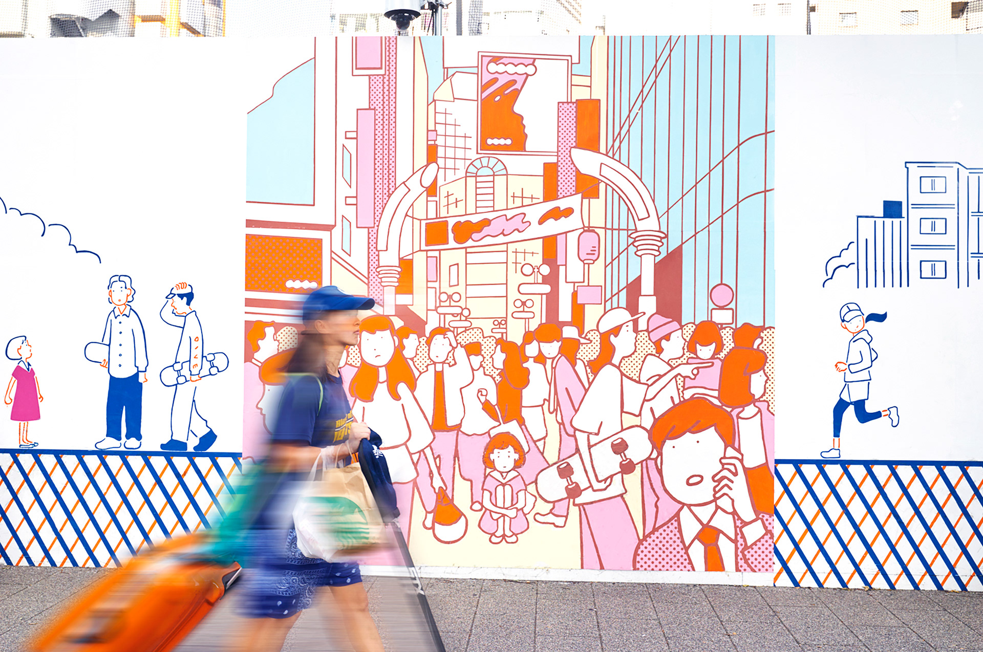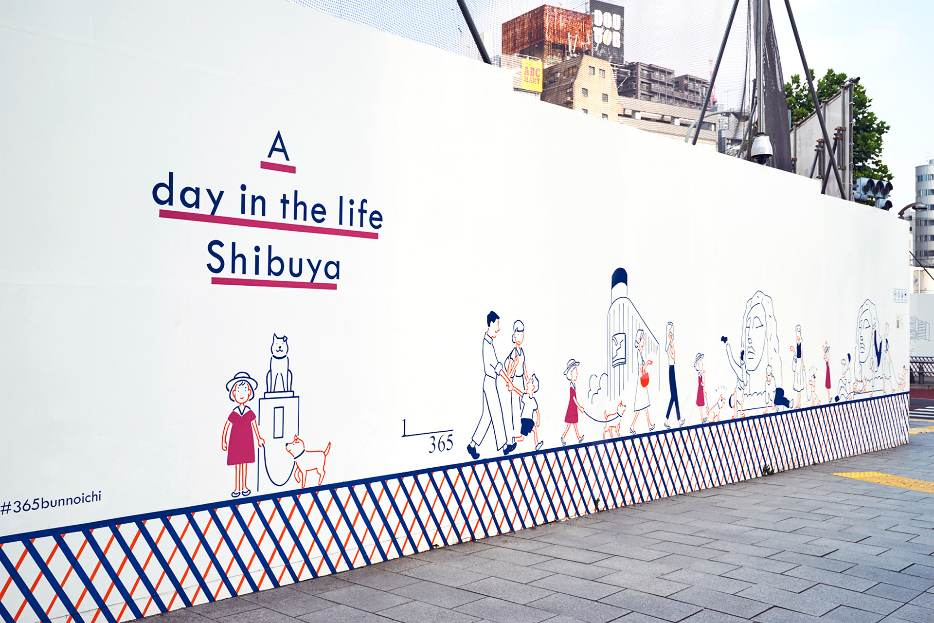 落書きや景観破壊を防止し、渋谷区の街の魅力を伝える為のアートワークを制作。200mの宮下公園の工事の仮囲い壁に渋谷の街を歩いてまわる女の子のストーリーを描き、旅をしていく中で様々な人々が絡み合い形成されていく、1つの物語のあるアートスポットにしました。GOOD DESIGN賞を受賞。その後、渋谷のお土産プロジェクトSHIBUKUROで商品化も実現しました。
