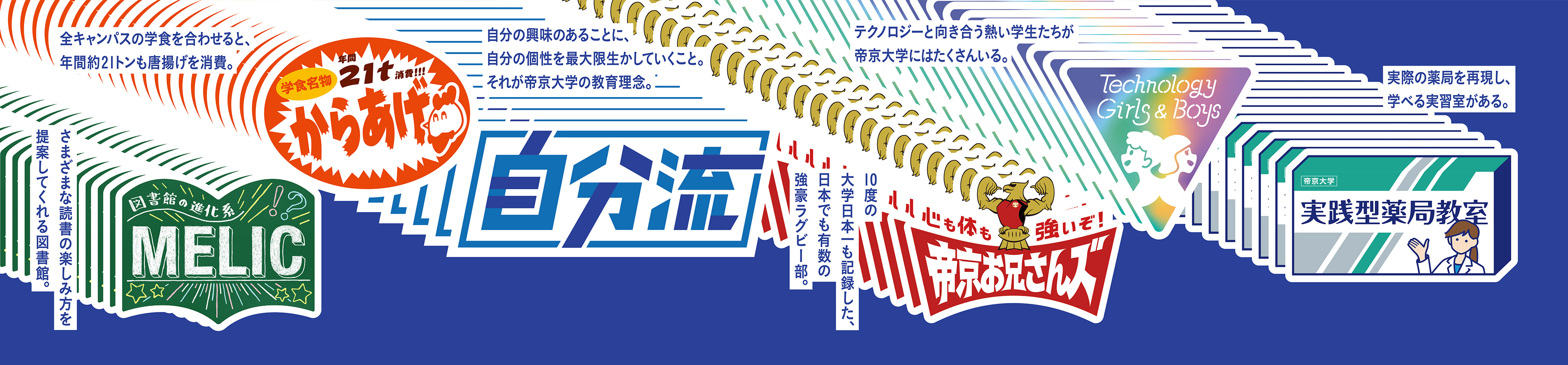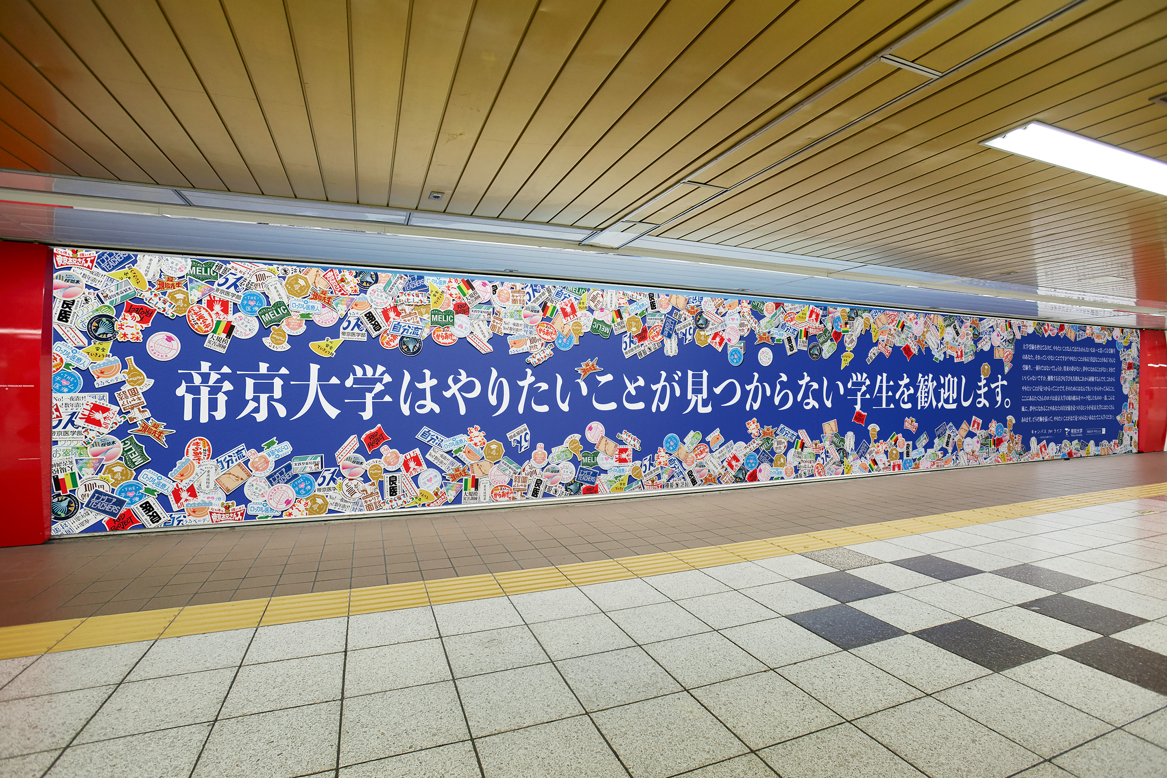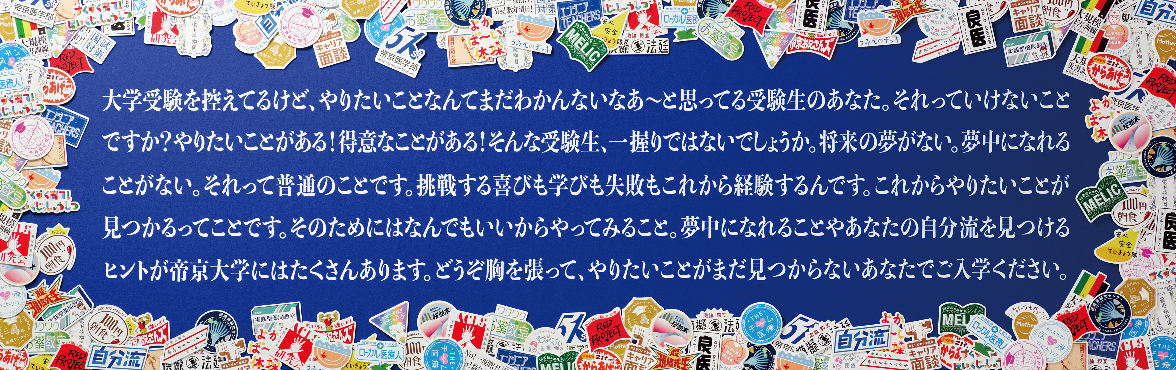 「やりたいことが見つからない学生を歓迎します。」というキャッチフレーズを掲げた、受験生向け応援広告。大学の活動や特徴をロゴマーク化した35種類の「TEIKYO LOGOS」を用いることで、キャンパスライフを通じて、やりたいことのヒントを見つけようと伝えた。